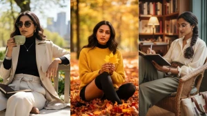 Create a high-fashion lifestyle editorial portrait of an elegant and sophisticated Indian woman, seated cross-legged on a cushioned bench in a sunny urban park. She holds a green tea mug in one hand, sipping it with poise and grace, exuding an air of elegance and allure. She wears a chic ensemble: A tailored black turtleneck sweater paired with high-waisted linen pants and a light trench coat, loosely tied at the waist. Accessories include oversized round tortoiseshell sunglasses, a delicate silver chain necklace, stacked silver bangle bracelets, and a sleek leather-bound notebook in her lap. Her hair flows in loose waves down her shoulders, with a natural side part. Makeup is fresh and natural, with subtle eyeliner and dewy cheeks. The background features vibrant park greenery, with a softly blurred city skyline in the distance, bringing focus to the model. The bright midday sunlight filters through trees, casting gentle shadows and highlighting her features for a fresh, radiant glow. Her pose is relaxed, with one arm resting on the back of the bench. Keep the face exactly the same as the uploaded photo for originality.