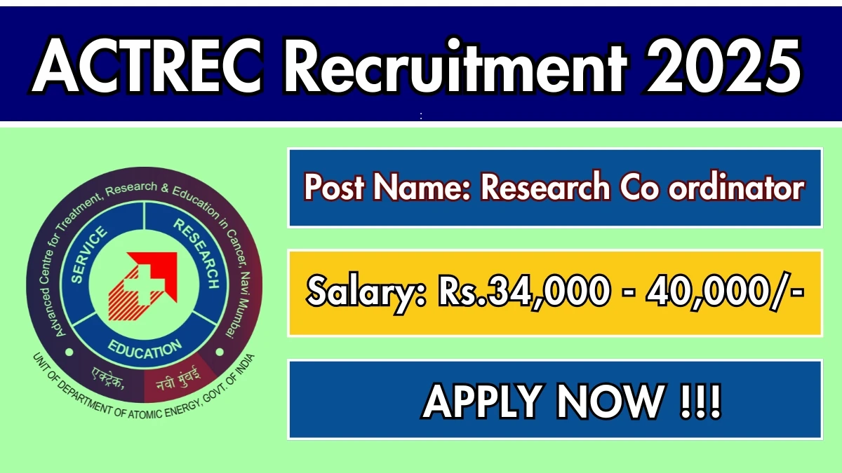 Advanced Centre for Treatment Research and Education in Cancer (ACTREC) Recruitment 2025 for posts of Research Co ordinator. Candidates with Any Graduate, Any Post Graduate Can attend the walkin. The Walk-in starts from Available Soon, and ends on 10-10-2025. For detailed information please visit ACTREC official website, actrec.gov.in.