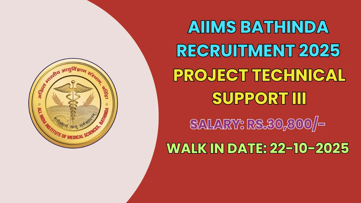 All India Institute of Medical Sciences Bathinda (AIIMS Bathinda) Recruitment 2025 for 01 posts of Project Technical Support III. Candidates with Any Graduate Can attend the walkin. The Walk-in on 22-10-2025. For detailed information please visit AIIMS Bathinda official website, aiimsbathinda.edu.in.