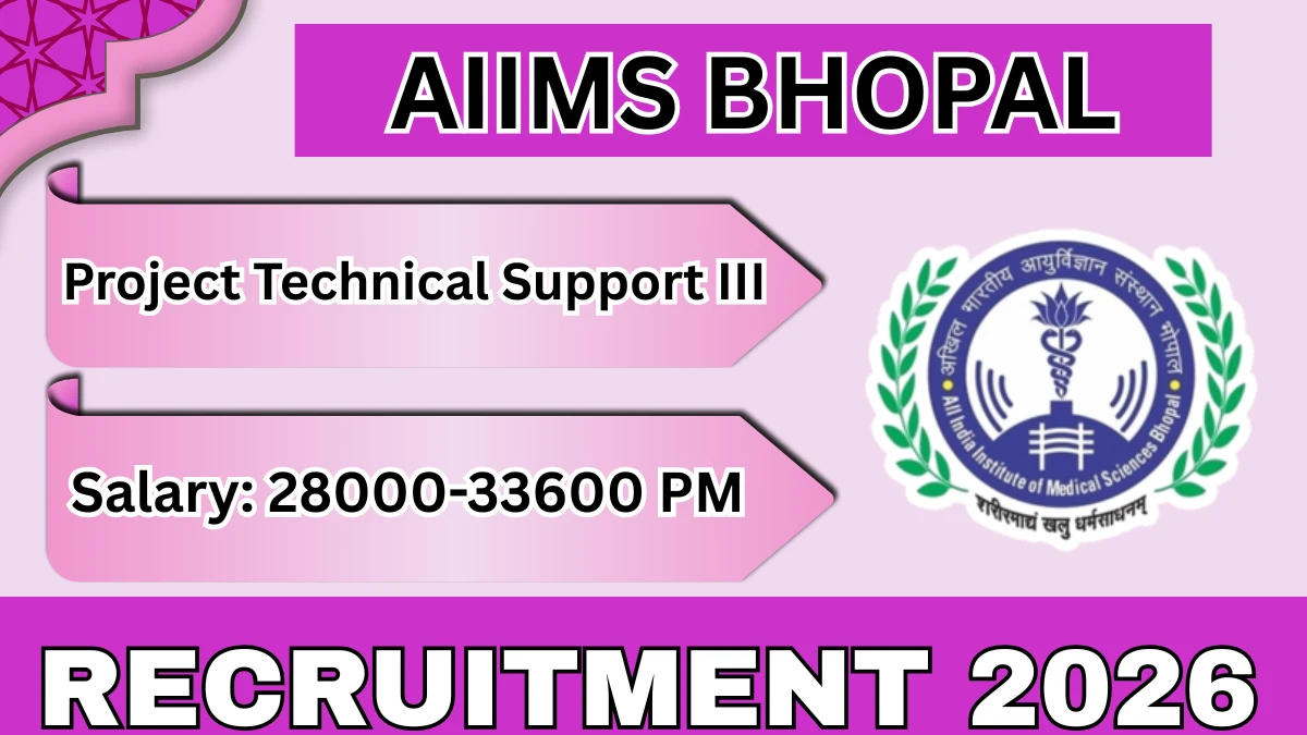 All India Institute of Medical Sciences Bhopal (AIIMS Bhopal) Recruitment 2026 for 01 posts of Project Technical Support III. Candidates with Any Graduate, Any Masters Degree Can attend the walkin. The Walk-in on 21-01-2026. For detailed information please visit AIIMS Bhopal official website, aiimsbhopal.edu.in.
