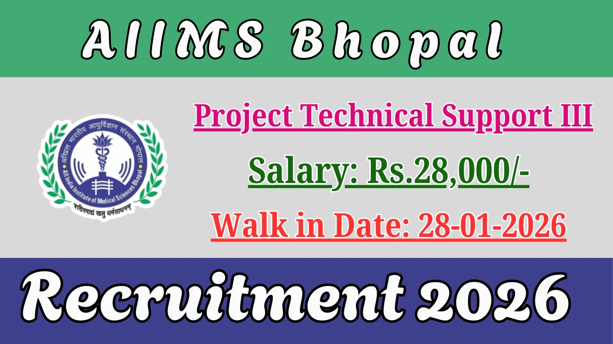 All India Institute of Medical Sciences Bhopal (AIIMS Bhopal) Recruitment 2026 for 01 posts of Project Technical Support III. Candidates with Any Graduate, M.Sc, BMLT, MLT Can attend the walkin. The Walk-in on 28-01-2026. For detailed information please visit AIIMS Bhopal official website, aiimsbhopal.edu.in.