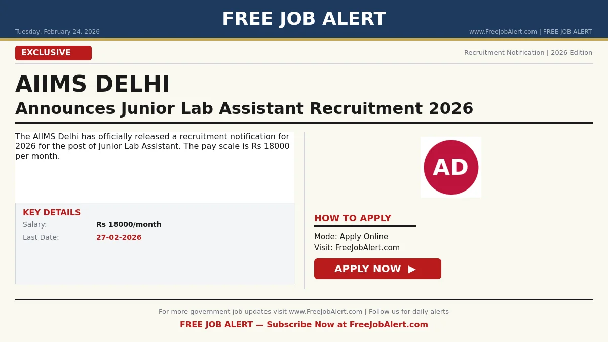 All India Institute of Medical Sciences, New Delhi (AIIMS Delhi) Recruitment 2026: All India Institute of Medical Sciences, New Delhi has released the official notification for 1 Junior Lab Assistant posts, inviting applications from eligible candidates. This recruitment provides an excellent opportunity for candidates seeking government jobs.