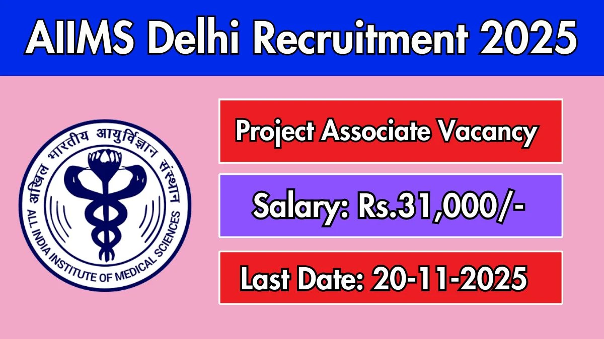 All India Institute of Medical Sciences Delhi (AIIMS Delhi) has released an official notification for the recruitment of 1 Project Associate Posts. Interested and eligible candidates can apply Offline through the official AIIMS Delhi website. The last date to submit the application form is 20-11-2025. In this article, you’ll find the AIIMS Delhi Project Associate Posts recruitment details, including eligibility criteria, age limit, salary structure, selection process, application steps, and direct links to the official notification and Offline application form.
