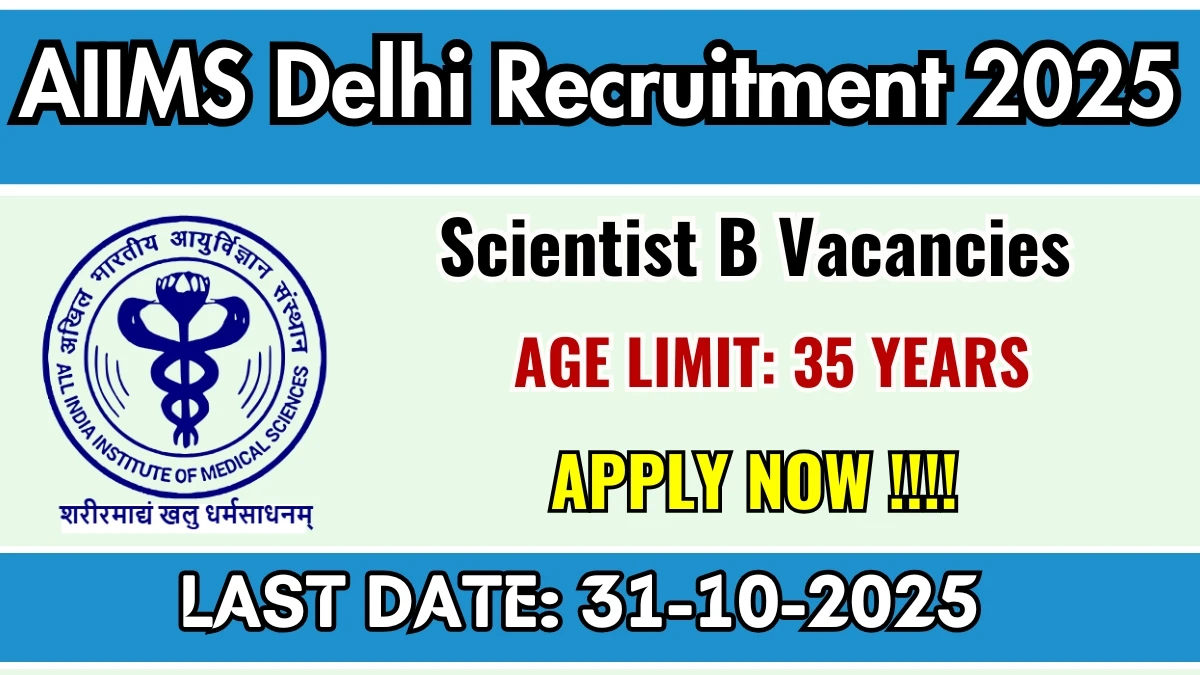 All India Institute Of Medical Sciences Delhi (AIIMS Delhi) has released an official notification for the recruitment of 01 Scientist B Posts. Interested and eligible candidates can apply Online through the official AIIMS Delhi website. The last date to submit the application form is 31-10-2025. In this article, you’ll find the AIIMS Delhi Scientist B Posts recruitment details, including eligibility criteria, age limit, salary structure, selection process, application steps, and direct links to the official notification and Online application form.