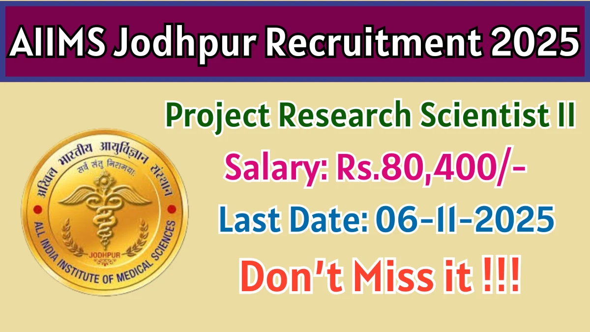 All India Institute of Medical Sciences Jodhpur (AIIMS Jodhpur) has released an official notification for the recruitment of 01 Project Research Scientist II Posts. Interested and eligible candidates can apply Offline through the official AIIMS Jodhpur website. The last date to submit the application form is 06-11-2025. In this article, you’ll find the AIIMS Jodhpur Project Research Scientist II Posts recruitment details, including eligibility criteria, age limit, salary structure, selection process, application steps, and direct links to the official notification and Offline application form.