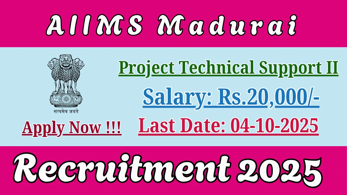 All India Institute of Medical Sciences Madurai (AIIMS Madurai) has released an official notification for the recruitment of 01 Project Technical Support II Posts. Interested and eligible candidates can apply Online through the official AIIMS Madurai website. The last date to submit the application form is 04-11-2025. In this article, you’ll find the AIIMS Madurai Project Technical Support II Posts recruitment details, including eligibility criteria, age limit, salary structure, selection process, application steps, and direct links to the official notification and Online application form.