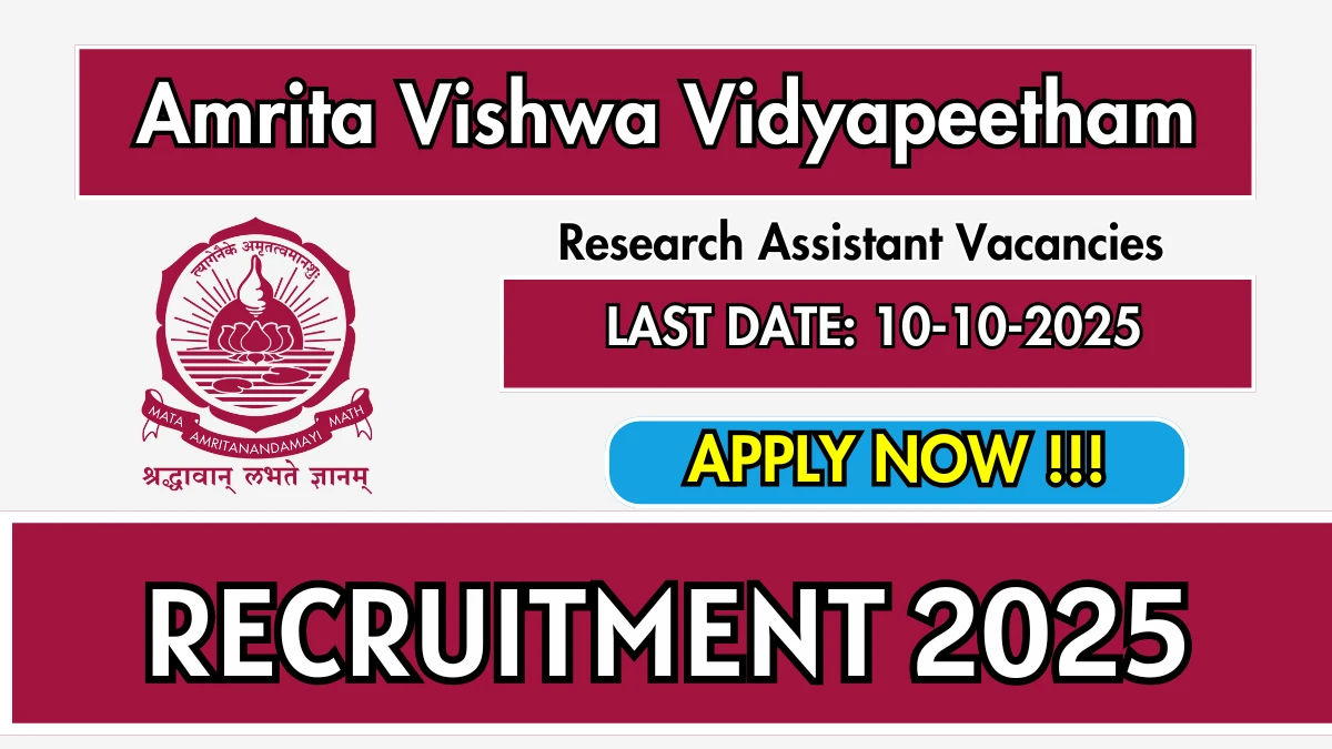 Amrita Vishwa Vidyapeetham Amritapuri has released an official notification for the recruitment of 01 Research Assistant Posts. Interested and eligible candidates can apply Online through the official Amrita Vishwa Vidyapeetham Amritapuri website. The last date to submit the application form is 10-10-2025. In this article, you’ll find the Amrita Vishwa Vidyapeetham Amritapuri Research Assistant Posts recruitment details, including eligibility criteria, age limit, salary structure, selection process, application steps, and direct links to the official notification and Online application form.