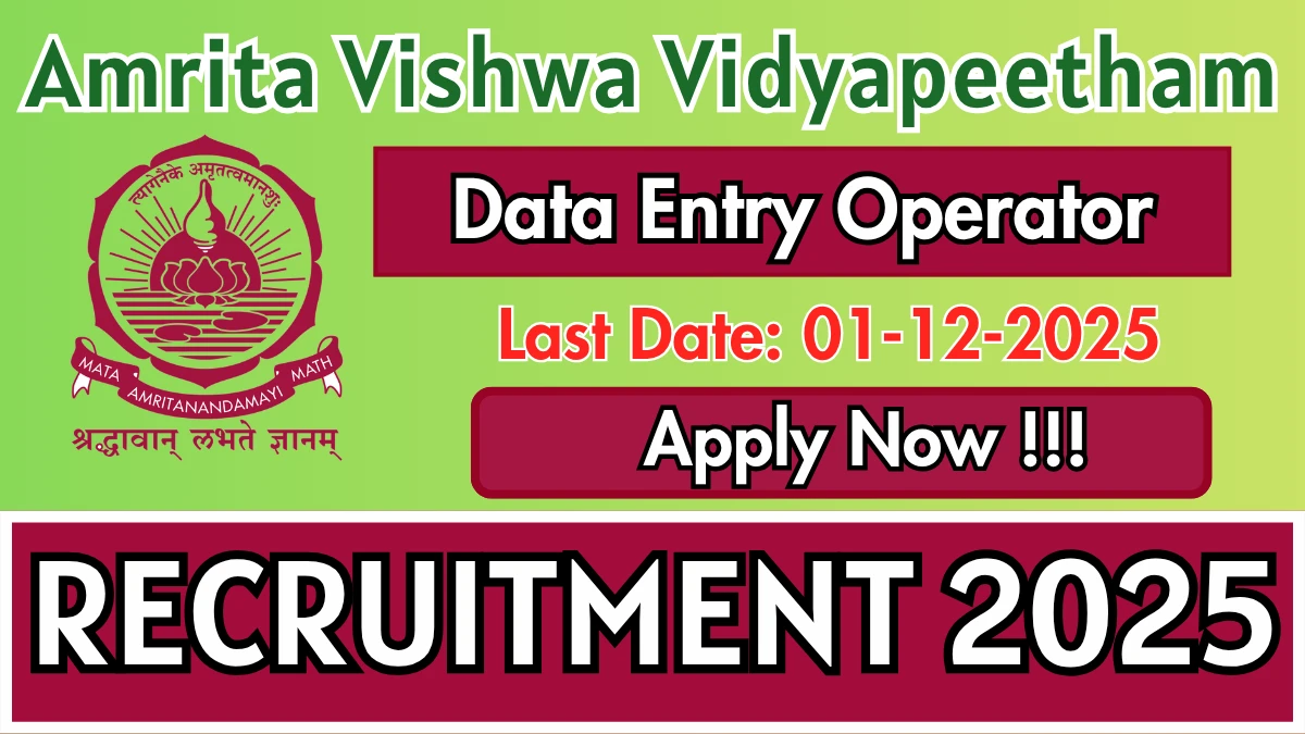 Amrita Vishwa Vidyapeetham has released an official notification for the recruitment of 01 Data Entry Operator Posts. Interested and eligible candidates can apply Online through the official Amrita Vishwa Vidyapeetham website. The last date to submit the application form is 01-12-2025. In this article, you’ll find the Amrita Vishwa Vidyapeetham Data Entry Operator Posts recruitment details, including eligibility criteria, age limit, salary structure, selection process, application steps, and direct links to the official notification and Online application form.