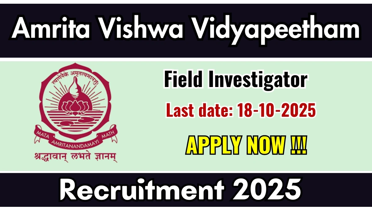Amrita Vishwa Vidyapeetham has released an official notification for the recruitment of 01 Field Investigator Posts. Interested and eligible candidates can apply Online through the official Amrita Vishwa Vidyapeetham website. The last date to submit the application form is 18-10-2025. In this article, you’ll find the Amrita Vishwa Vidyapeetham Field Investigator Posts recruitment details, including eligibility criteria, age limit, salary structure, selection process, application steps, and direct links to the official notification and Online application form.