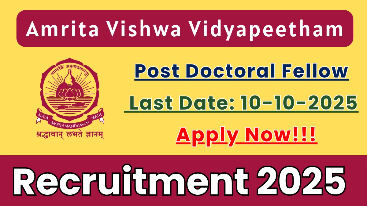 Amrita Vishwa Vidyapeetham has released an official notification for the recruitment of 01 Post Doctoral Fellow Posts. Interested and eligible candidates can apply Online through the official Amrita Vishwa Vidyapeetham website. The last date to submit the application form is 10-10-2025. In this article, you’ll find the Amrita Vishwa Vidyapeetham Post Doctoral Fellow Posts recruitment details, including eligibility criteria, age limit, salary structure, selection process, application steps, and direct links to the official notification and Online application form.