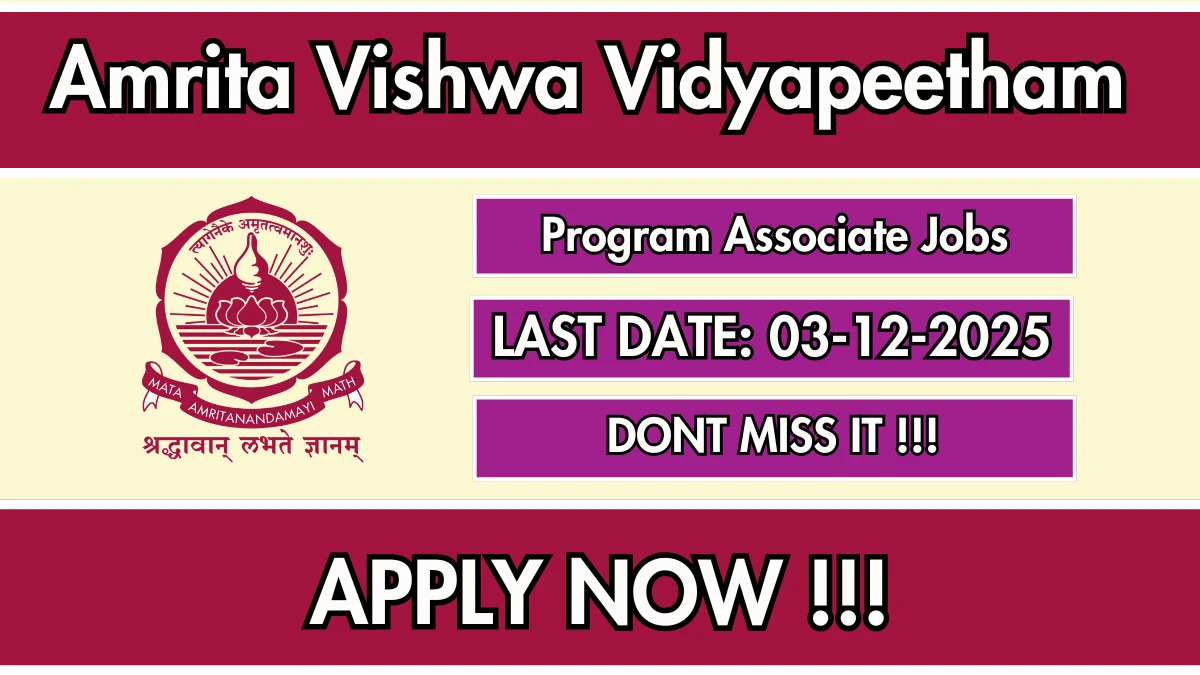 Amrita Vishwa Vidyapeetham has released an official notification for the recruitment of 01 Program Associate Posts. Interested and eligible candidates can apply Online through the official Amrita Vishwa Vidyapeetham website. The last date to submit the application form is 03-12-2025. In this article, you’ll find the Amrita Vishwa Vidyapeetham Program Associate Posts recruitment details, including eligibility criteria, age limit, salary structure, selection process, application steps, and direct links to the official notification and Online application form.