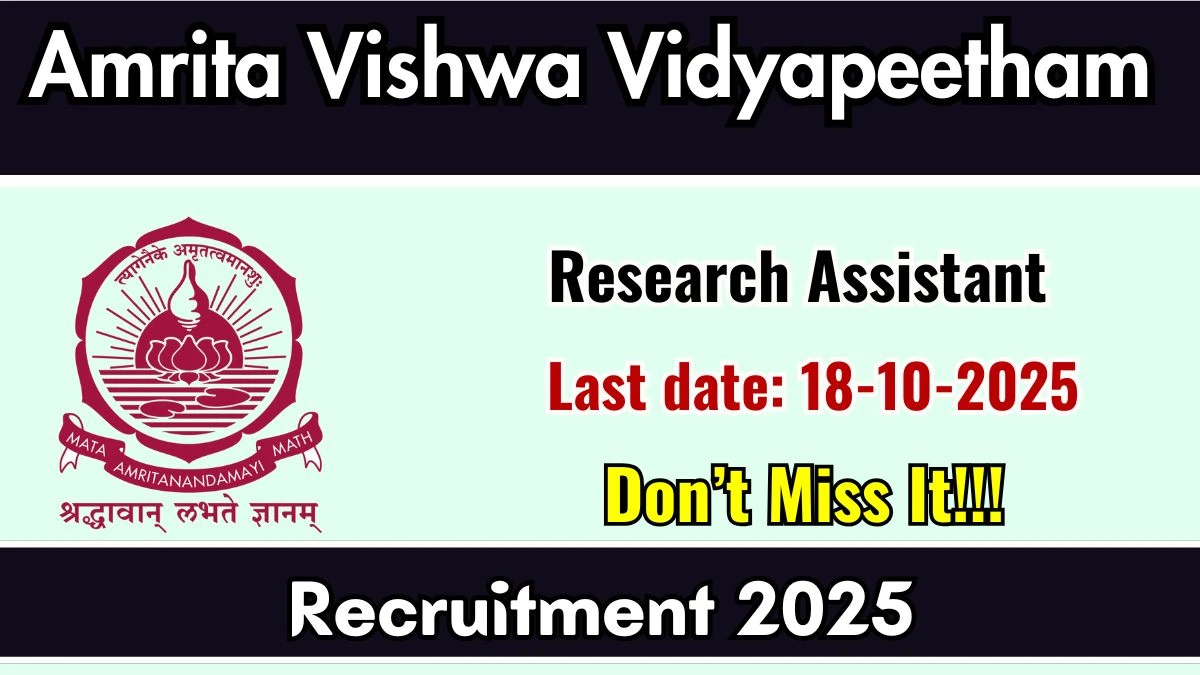Amrita Vishwa Vidyapeetham has released an official notification for the recruitment of 01 Research Assistant Posts. Interested and eligible candidates can apply Online through the official Amrita Vishwa Vidyapeetham website. The last date to submit the application form is 18-10-2025. In this article, you’ll find the Amrita Vishwa Vidyapeetham Research Assistant Posts recruitment details, including eligibility criteria, age limit, salary structure, selection process, application steps, and direct links to the official notification and Online application form.