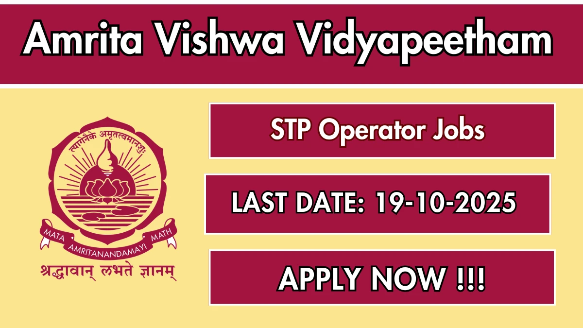 Amrita Vishwa Vidyapeetham has released an official notification for the recruitment of 02 STP Operator Posts. Interested and eligible candidates can apply Online through the official Amrita Vishwa Vidyapeetham website. The last date to submit the application form is 19-10-2025. In this article, you’ll find the Amrita Vishwa Vidyapeetham STP Operator Posts recruitment details, including eligibility criteria, age limit, salary structure, selection process, application steps, and direct links to the official notification and Online application form.