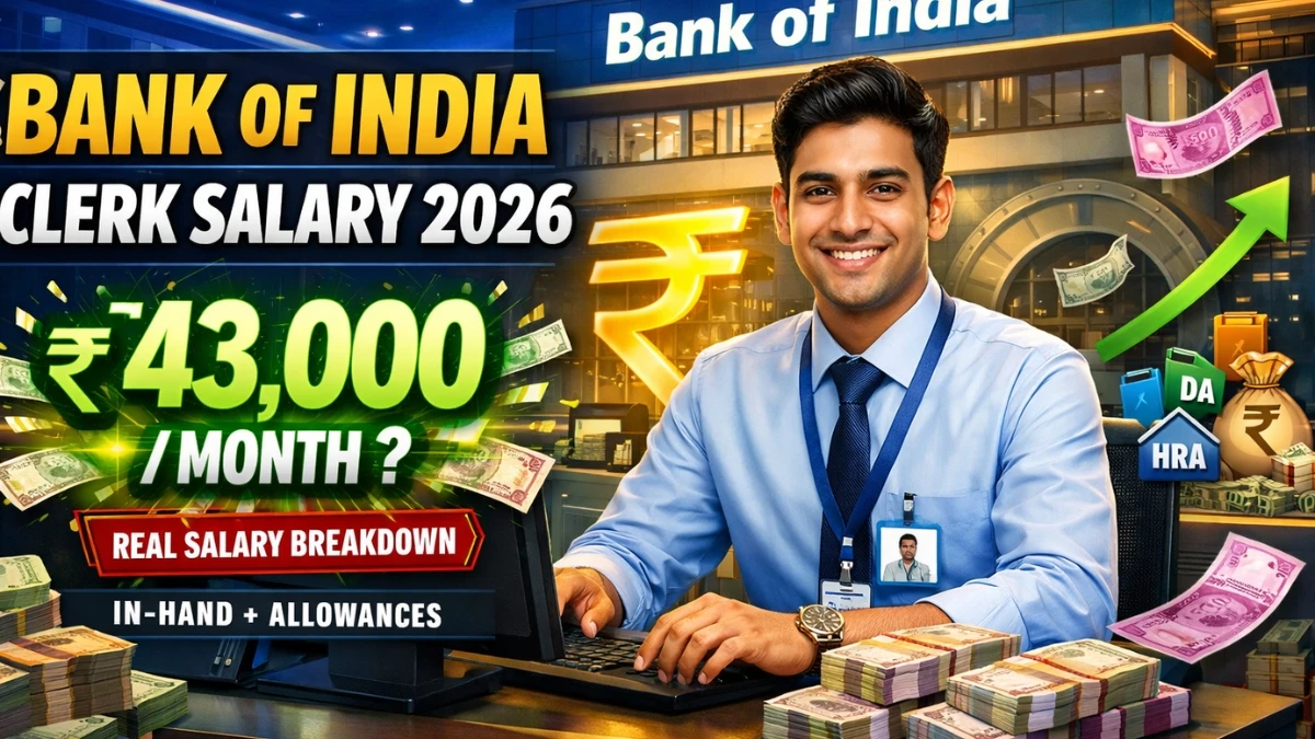 The Bank of India Clerk Salary 2026 starts with a basic pay of ₹24,050, with a gross monthly salary of around ₹40,000–₹46,000 and an in-hand salary ranging between ₹37,000 and ₹43,000 per month, depending on posting location, current Dearness Allowance (DA) rates, and deductions.