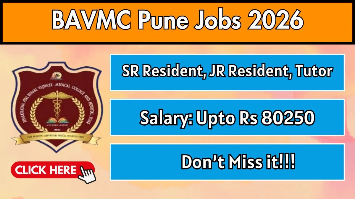 Bharatratna Atalbihari Vajpayee Medical College and Hospital (BAVMC Pune) Recruitment 2025 for 60 posts of Senior Resident, Junior Resident and Tutor. Candidates Can attend the walkin. The Walk-in starts from 28-01-2026, and ends on 29-01-2026. For detailed information please visit BAVMC Pune official website, https://www.bavmcpune.edu.in/.
