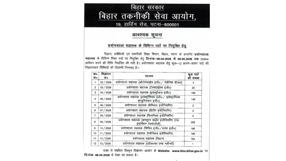 The Bihar Technical Service Commission (Bihar BTSC) Recruitment 2026 Short notification released for 1091 posts of Laboratory Assistant. Candidates with B.Tech/B.E, Diploma Can Apply Online. The Online application process for Bihar BTSC Recruitment 2026 has started on 06-04-2026 and will remain open until 06-05-2026. The candidate shall apply online through Bihar BTSC website, btsc.bihar.gov.in.