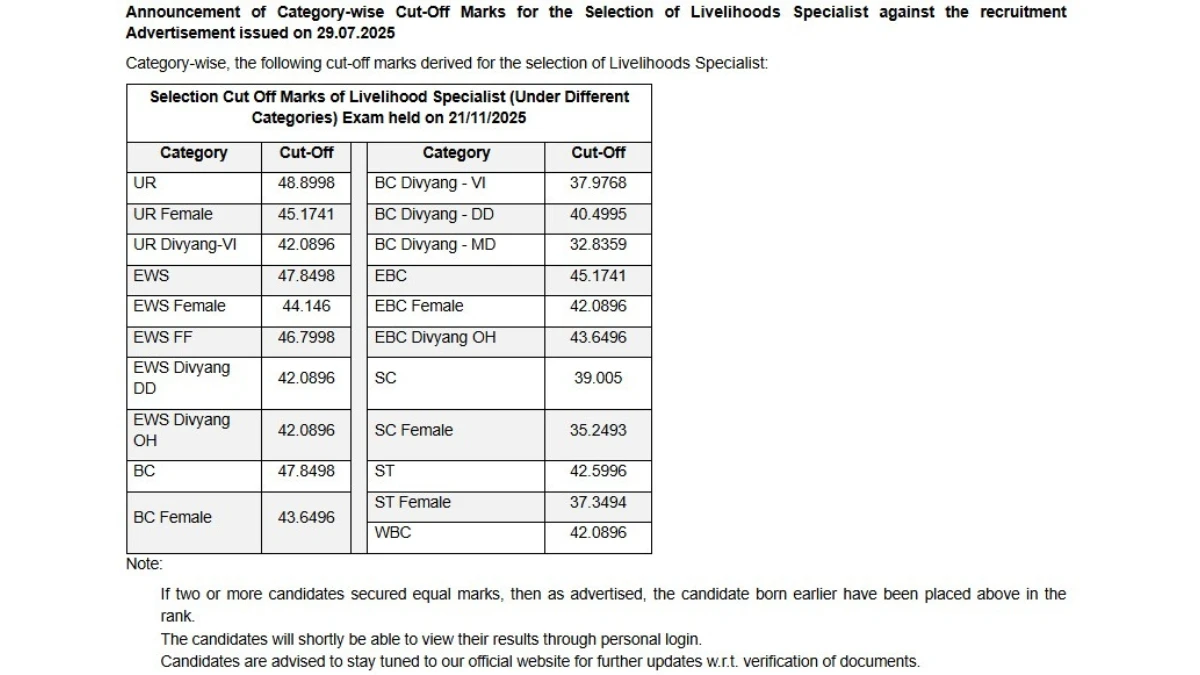Note: These are the official cut-off marks released for the Livelihood Specialist post. Exact figures may vary slightly by post if multiple recruitments are ongoing. Candidates are advised to check the official PDF for complete details.