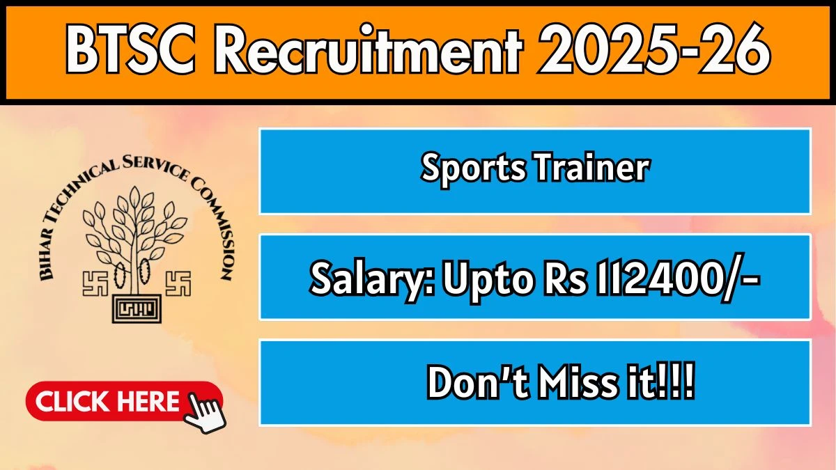 The Bihar Technical Service Commission (BTSC) Recruitment 2025 for 65 posts of Sports Trainer. Candidates with Any Graduate, Diploma Can Apply Online. The online application opens on 22-12-2025, and closes on 22-01-2026. The candidate shall apply online through BTSC website, btsc.bihar.gov.in.