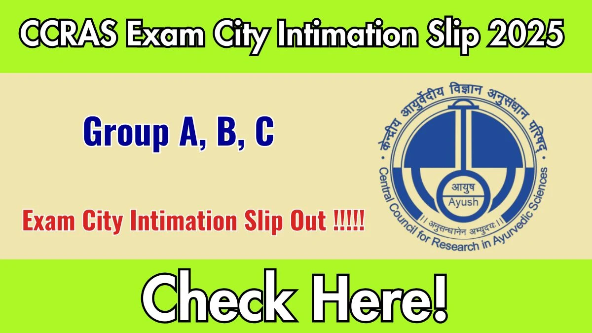 CCRAS Group A, B, and C Exam City Intimation Slip 2025 is Out! On 17 November 2025 Central Council for Research in Ayurvedic Sciences has officially released the CCRAS Group A, B, and C Exam City Intimation Slip 2025. Candidates who have applied for the Group A, B, and C Exam can now download their Exam City Intimation Slip from the official website ccras.nic.in.
