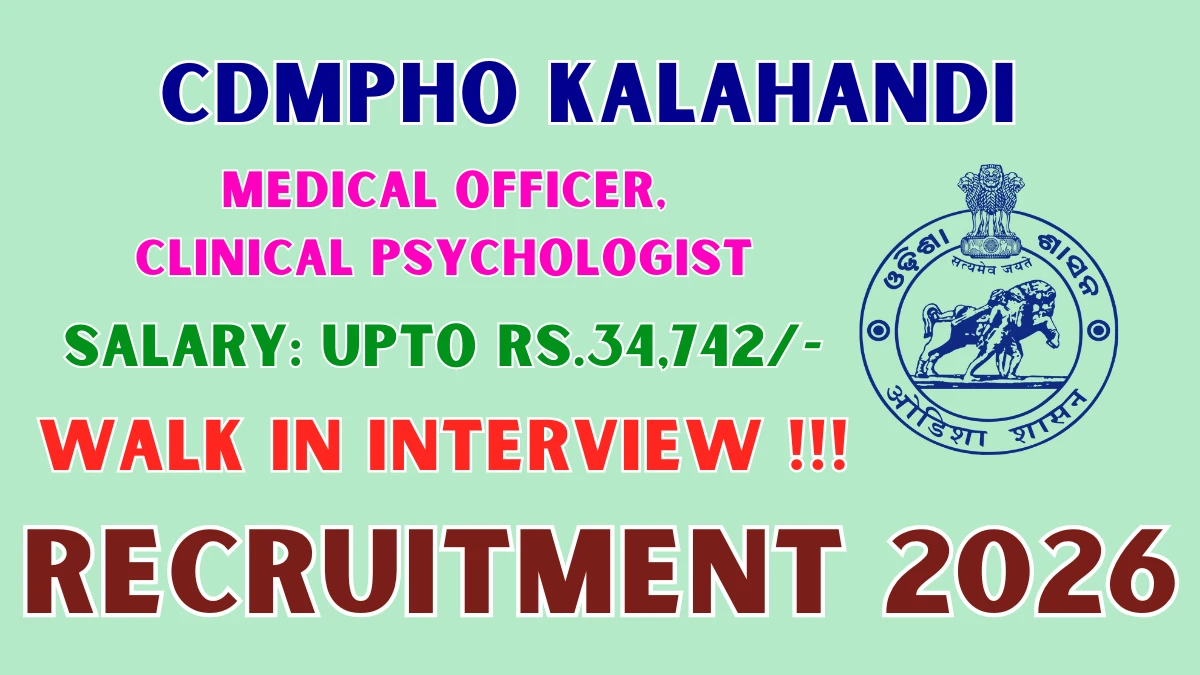 Chief District Medical And Public Health Office (CDMPHO Kalahandi) Recruitment 2026 for 28 posts of Medical Officer, Clinical Psychologist. Candidates with BHMS, M.E/M.Tech Can attend the walkin. The Walk-in starts from 28-01-2026, and ends on 31-01-2026. For detailed information please visit CDMPHO Kalahandi official website, kalahandi.odisha.gov.in.