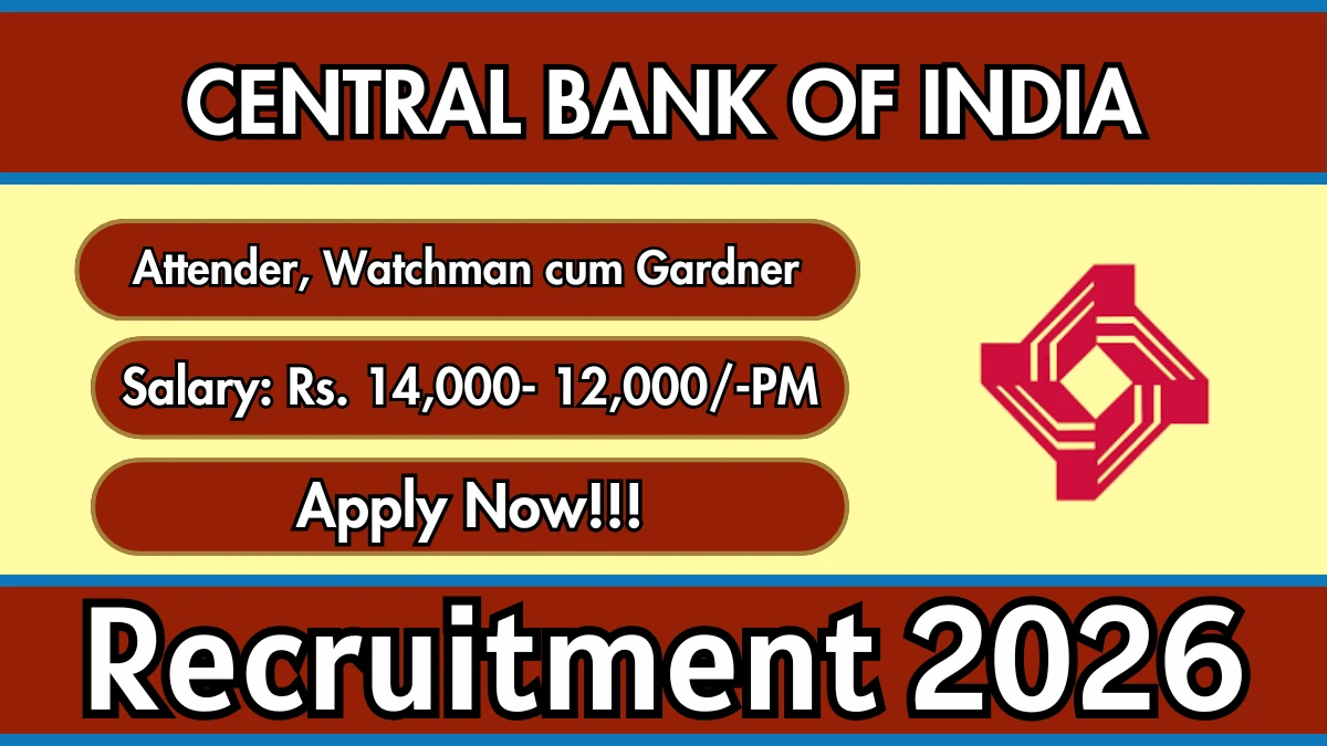 Central Bank of India Recruitment 2026: Central Bank of India has released the official notification for 2 Attender & Watchman cum Gardner posts, inviting applications from eligible candidates. This recruitment provides an excellent opportunity for candidates seeking stable and well-paid government jobs. Candidates can download the application form from the official website and send the completed form along with required documents by post. The last date to receive the application is 20-03-2026. Below, you can find complete details of Attender & Watchman cum Gardner Recruitment 2026, including vacancy breakdown, eligibility, age limit, salary, selection process, application procedure, and important links.