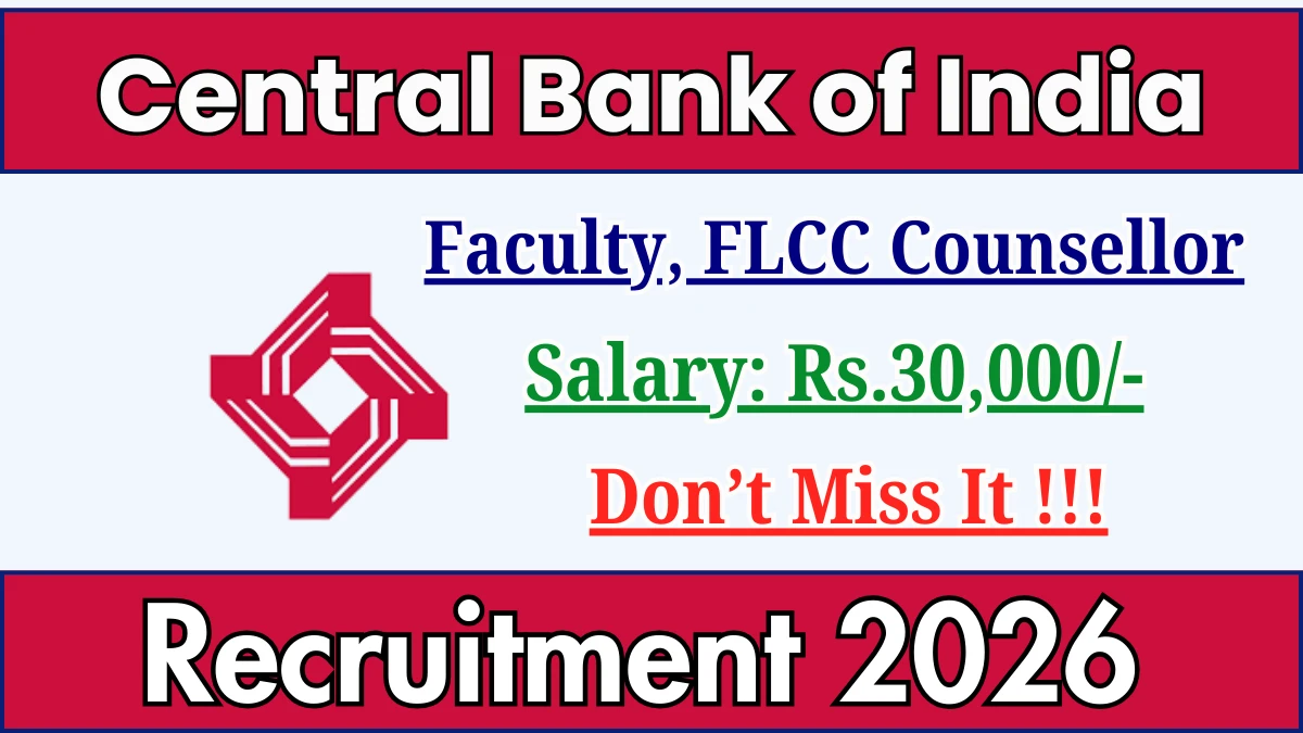 Central Bank of India has released an official notification for the recruitment of 02 Faculty, FLCC Counsellor Posts. Interested and eligible candidates can apply Offline through the official Central Bank of India website. The last date to submit the application form is 20-02-2026. In this article, you’ll find the Central Bank of India Faculty, FLCC Counsellor Posts recruitment details, including eligibility criteria, age limit, salary structure, selection process, application steps, and direct links to the official notification and Offline application form.