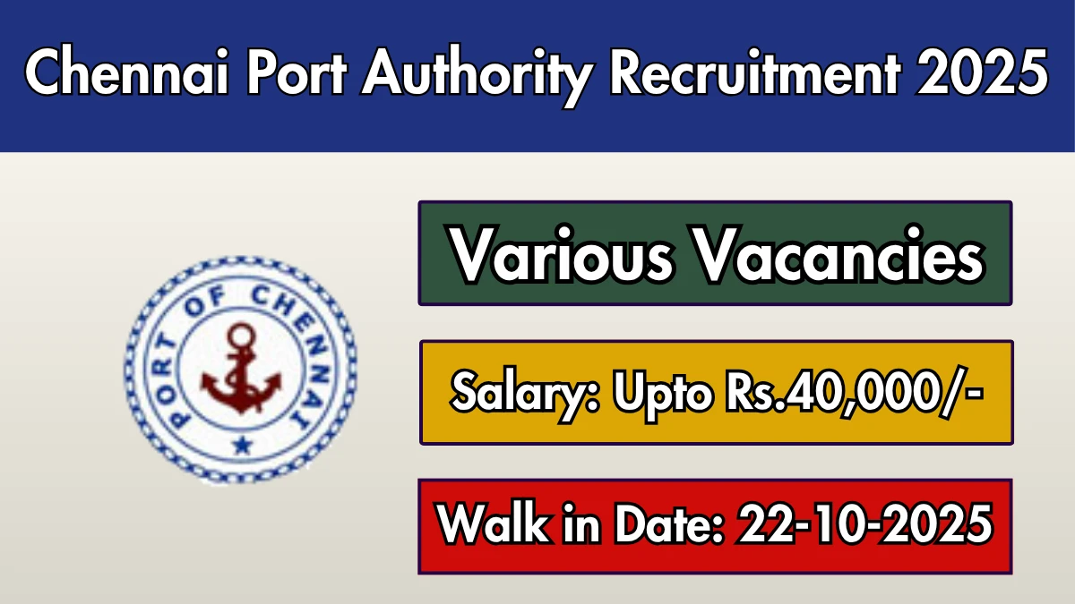Chennai Port Authority Recruitment 2025 for 06 posts of PG Teacher, Accountant and More. Candidates with Any Bachelors Degree, B.Ed, Diploma, M.A, M.Com Can attend the walkin. The Walk-in starts on 22-10-2025. For detailed information please visit Chennai Port Authority official website, chennaiport.gov.in.