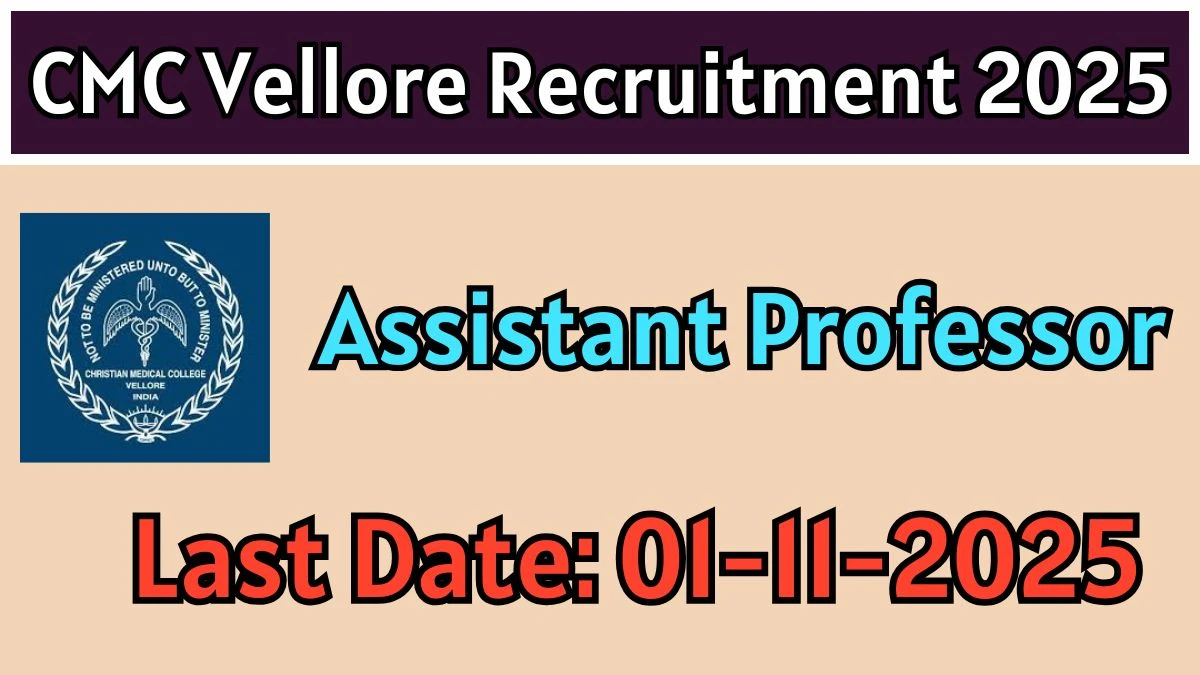 Christian Medical College Vellore (CMC Vellore) has released an official notification for the recruitment of Assistant Professor Posts. Interested and eligible candidates can apply Online through the official CMC Vellore website. The last date to submit the application form is 01-11-2025. In this article, you’ll find the CMC Vellore Assistant Professor Posts recruitment details, including eligibility criteria, age limit, salary structure, selection process, application steps, and direct links to the official notification and Online application form.
