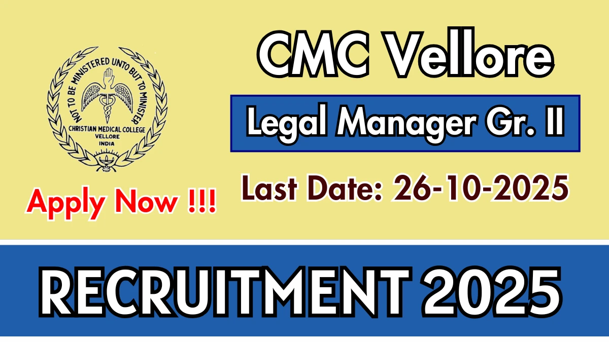Christian Medical College Vellore (CMC Vellore) has released an official notification for the recruitment of Legal Manager Gr. II Posts. Interested and eligible candidates can apply Online through the official CMC Vellore website. The last date to submit the application form is 26-10-2025. In this article, you’ll find the CMC Vellore Legal Manager Gr. II Posts recruitment details, including eligibility criteria, age limit, salary structure, selection process, application steps, and direct links to the official notification and Online application form.