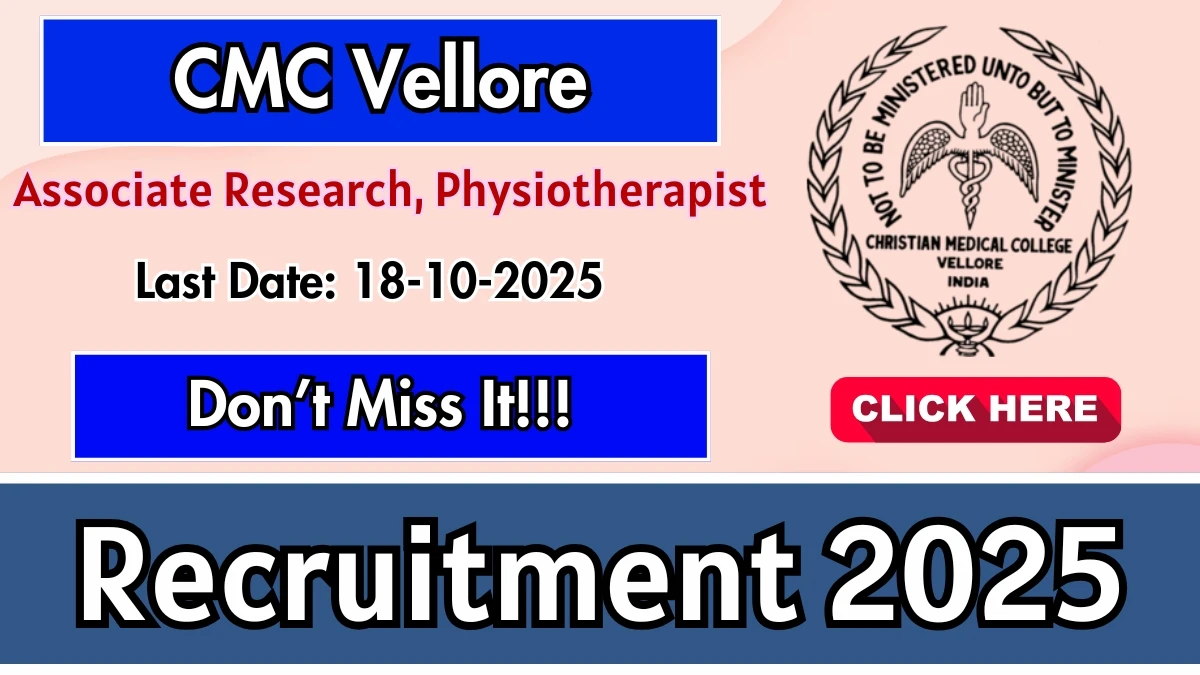 Christian Medical College Vellore (CMC Vellore) has released an official notification for the recruitment of Associate Research, Physiotherapist Posts. Interested and eligible candidates can apply Online through the official CMC Vellore website. The last date to submit the application form is 18-10-2025. In this article, you’ll find the CMC Vellore Associate Research, Physiotherapist Posts recruitment details, including eligibility criteria, age limit, salary structure, selection process, application steps, and direct links to the official notification and Online application form.