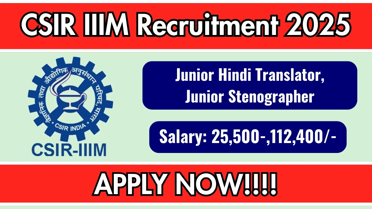 Indian Institute of Integrative Medicine (CSIR IIIM) has released an official notification for the recruitment of 04 Junior Hindi Translator, Junior Stenographer Posts. Interested and eligible candidates can apply Online through the official CSIR IIIM website. The last date to submit the application form is 13-11-2025. In this article, you’ll find the CSIR IIIM Junior Hindi Translator, Junior Stenographer Posts recruitment details, including eligibility criteria, age limit, salary structure, selection process, application steps, and direct links to the official notification and Online application form.