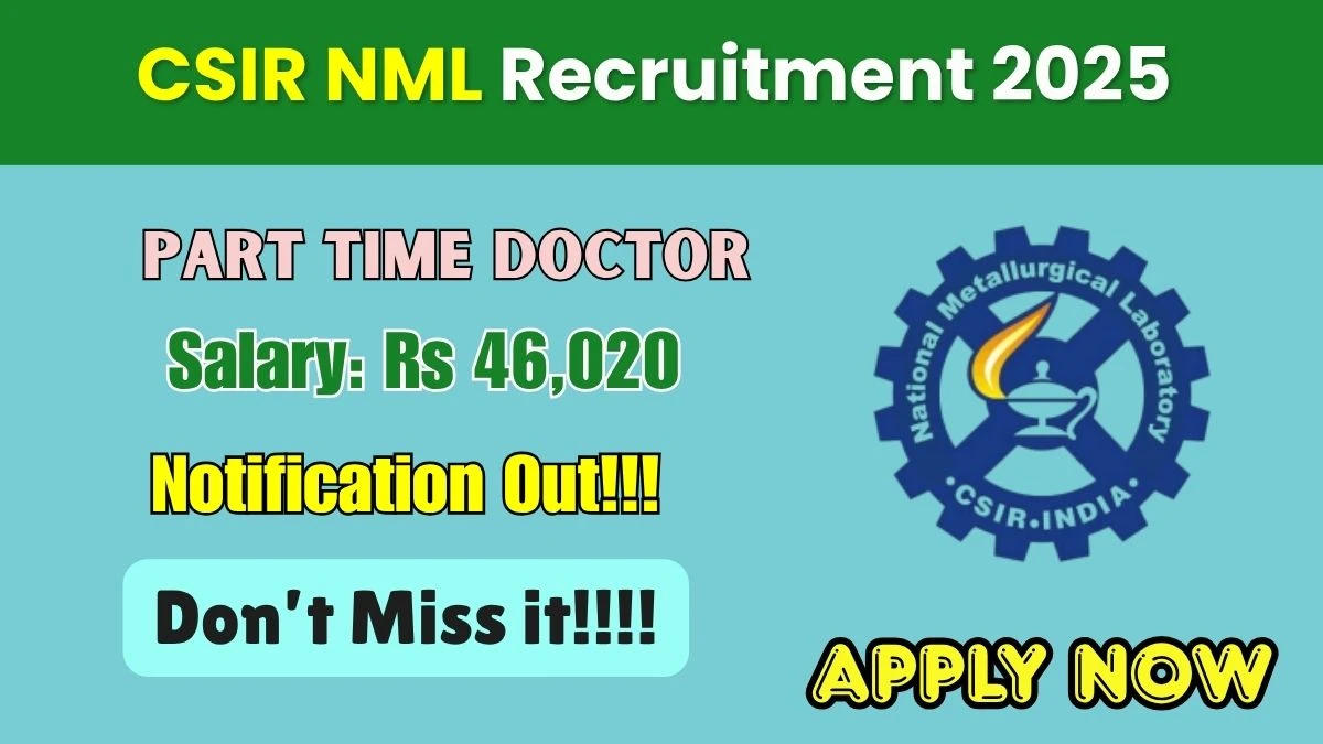 CSIR National Metallurgical Laboratory (CSIR NML) Recruitment 2025 for 01 posts of Part Time Doctor. Candidates with MBBS Can attend the walkin. The Walk-in interview on 17-10-2025. For detailed information please visit CSIR NML official website, nml.res.in.