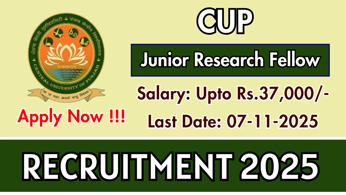 Central University of Punjab (CUP) has released an official notification for the recruitment of 01 Junior Research Fellow Posts. Interested and eligible candidates can apply Offline through the official CUP website. The last date to submit the application form is 07-11-2025. In this article, you’ll find the CUP Junior Research Fellow Posts recruitment details, including eligibility criteria, age limit, salary structure, selection process, application steps, and direct links to the official notification and Offline application form.