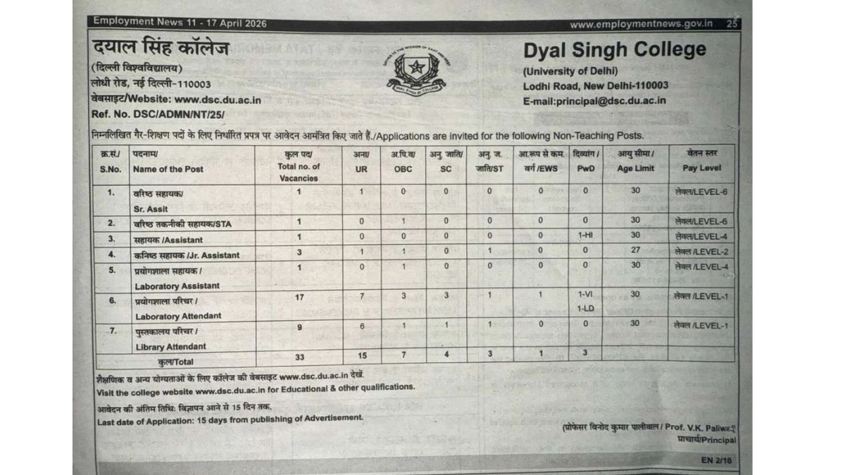 Dayal Singh College Delhi (DSC) Non-Teaching Posts Notification 2026 has been released on the official website www.dsc.du.ac.in . A total of 33 vacancies have been announced through the DSC Non-Teaching Posts Recruitment 2026.