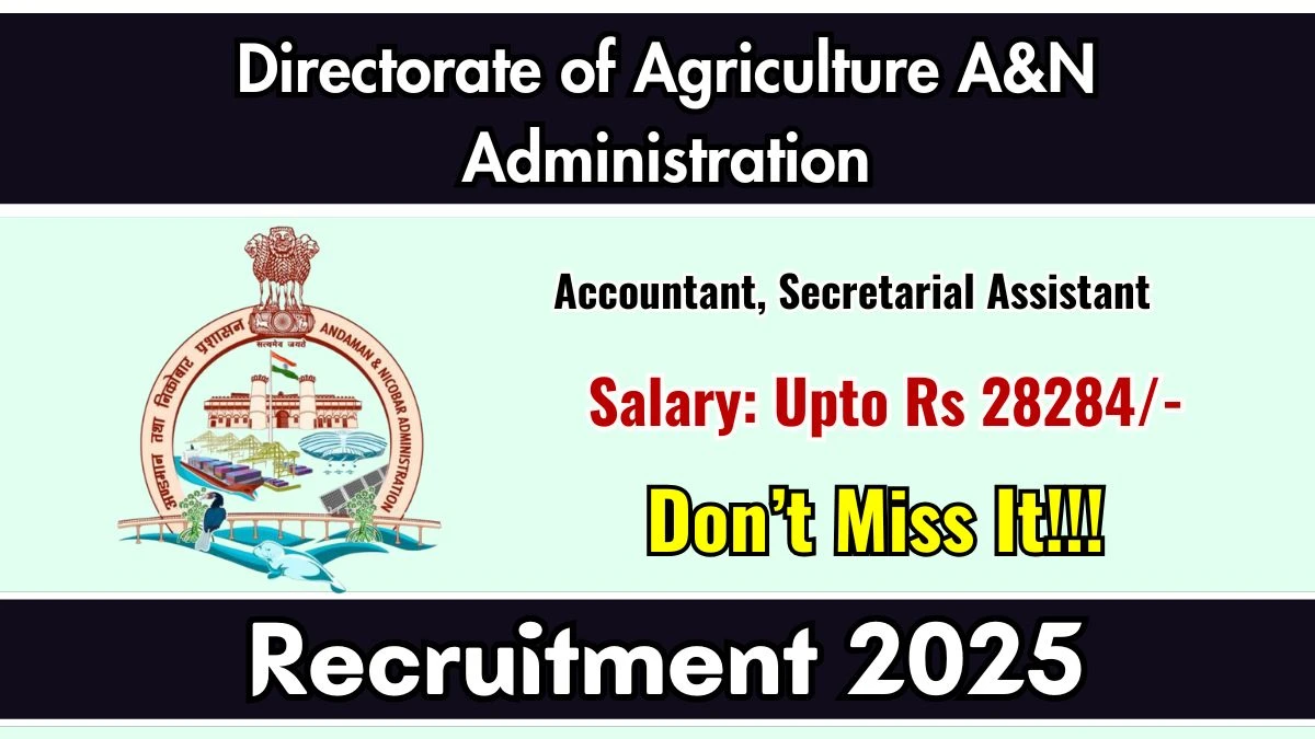Directorate of Agriculture, A&N Administration has released an official notification for the recruitment of 02 Accountant, Secretarial Assistant Posts. Interested and eligible candidates can apply Online through the official Directorate of Agriculture, A&N Administration website. The last date to submit the application form is 30-12-2025. In this article, you’ll find the Directorate of Agriculture, A&N Administration Accountant, Secretarial Assistant Posts recruitment details, including eligibility criteria, age limit, salary structure, selection process, application steps, and direct links to the official notification and Online application form.