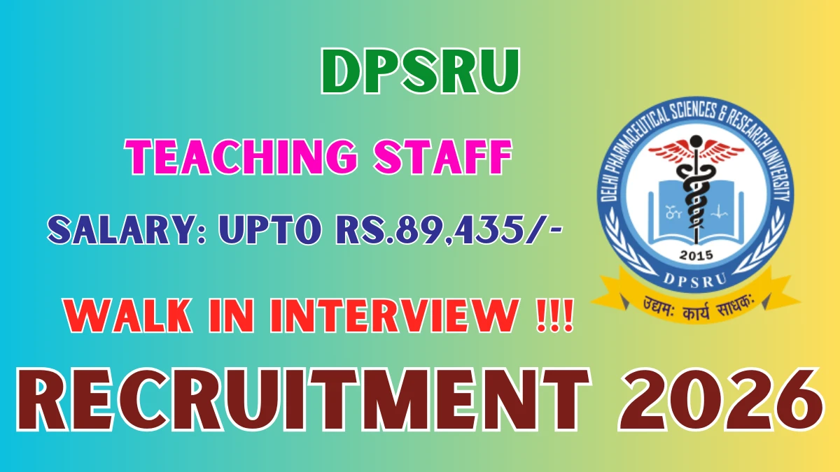 Delhi Pharmaceutical Sciences and Research University (DPSRU) Recruitment 2026 for 12 posts of Teaching Staff. Candidates with B.Pharma, B.Sc, Any Masters Degree, M.Pharma, M.Phil/Ph.D Can attend the walkin. The Walk-in starts from 09-02-2026, and ends on 12-02-2026. For detailed information please visit DPSRU official website, https://dpsru.edu.in.