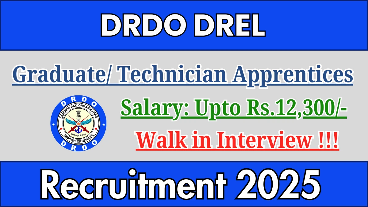 Defence Electronics Research Laboratory (DRDO DREL) Recruitment 2025 for 46 posts of Graduate/ Technician Apprentices. Candidates with B.Com, B.Tech/B.E, Diploma Can attend the walkin. The Walk-in starts from 22-12-2025, and ends on 23-12-2025. For detailed information please visit DRDO DREL official website, drdo.gov.in.