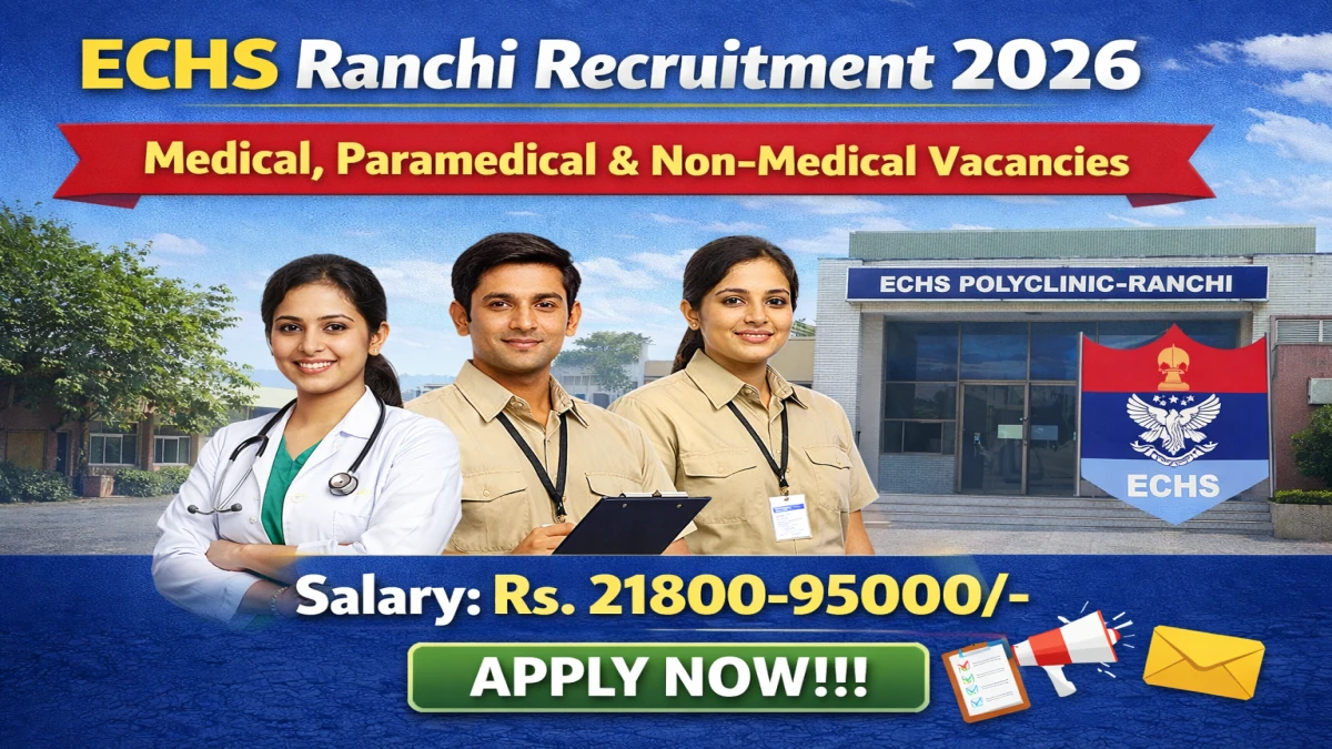 The Ex-Servicemen Contributory Health Scheme (ECHS), under the Ministry of Defence, Government of India, has released the official recruitment notification for ECHS Ranchi Recruitment 2026–27. A total of 15 contractual vacancies have been announced for Medical, Paramedical, and Non-Medical staff across ECHS Polyclinics located in Ranchi, Daltonganj, Chaibasa, and Gumla. Interested candidates must submit their application in offline mode before 12 February 2026. The recruitment process will include document verification and interview for shortlisted candidates. Complete details regarding eligibility criteria, age limit, salary, vacancy distribution, and how to apply are provided below.