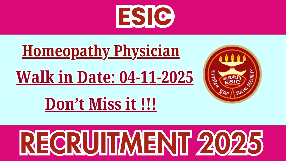 Employees State Insurance Corporation (ESIC) Recruitment 2025 for 01 posts of Homeopathy Physician. Candidates Can attend the walkin. The Walk-in on 04-11-2025. For detailed information please visit ESIC official website, esic.gov.in.