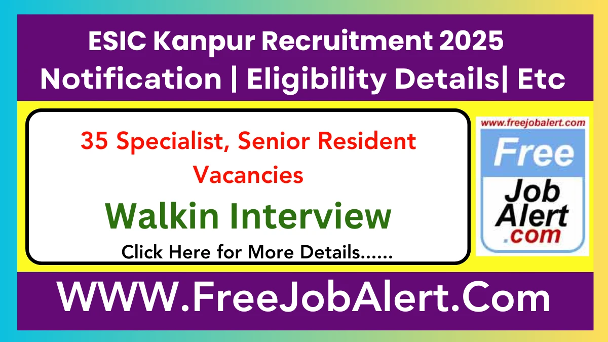 Employees State Insurance Corporation (ESIC Kanpur) recruits 35 Specialist, Senior Resident Posts. Candidates with Post Graduate, PG Diploma (Relevant Field) can attend for walk in on 17-02-2025