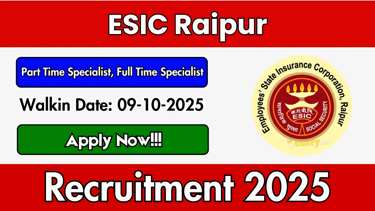 Employees State Insurance Corporation (ESIC Raipur) Recruitment 2025 for 08 posts of Part Time Specialist, Full Time Specialist. Candidates with Diploma, DNB, M.Sc, PG Diploma Can attend the walkin. The Walk-in starts from 29-09-2025, and ends on 09-10-2025. For detailed information please visit ESIC Raipur official website, esic.gov.in.