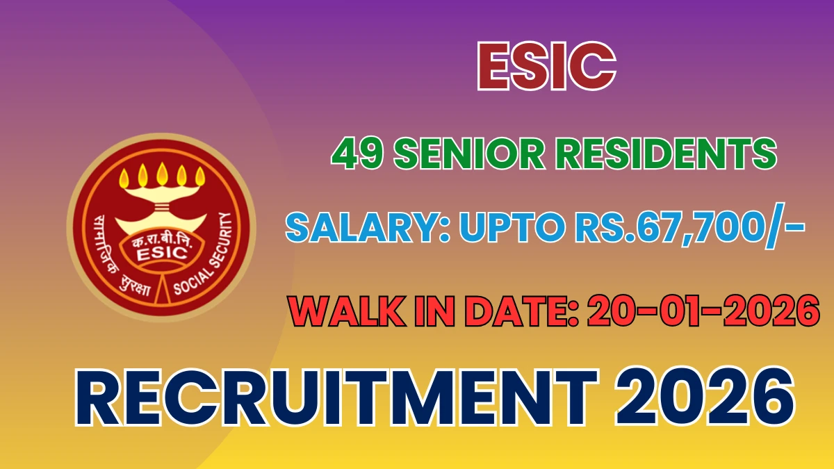 Employees State Insurance Corporation (ESIC) Recruitment 2026 for 49 posts of Senior Residents. Candidates with MBBS Can attend the walkin. The Walk-in on 20-01-2026. For detailed information please visit ESIC official website, esic.gov.in.
