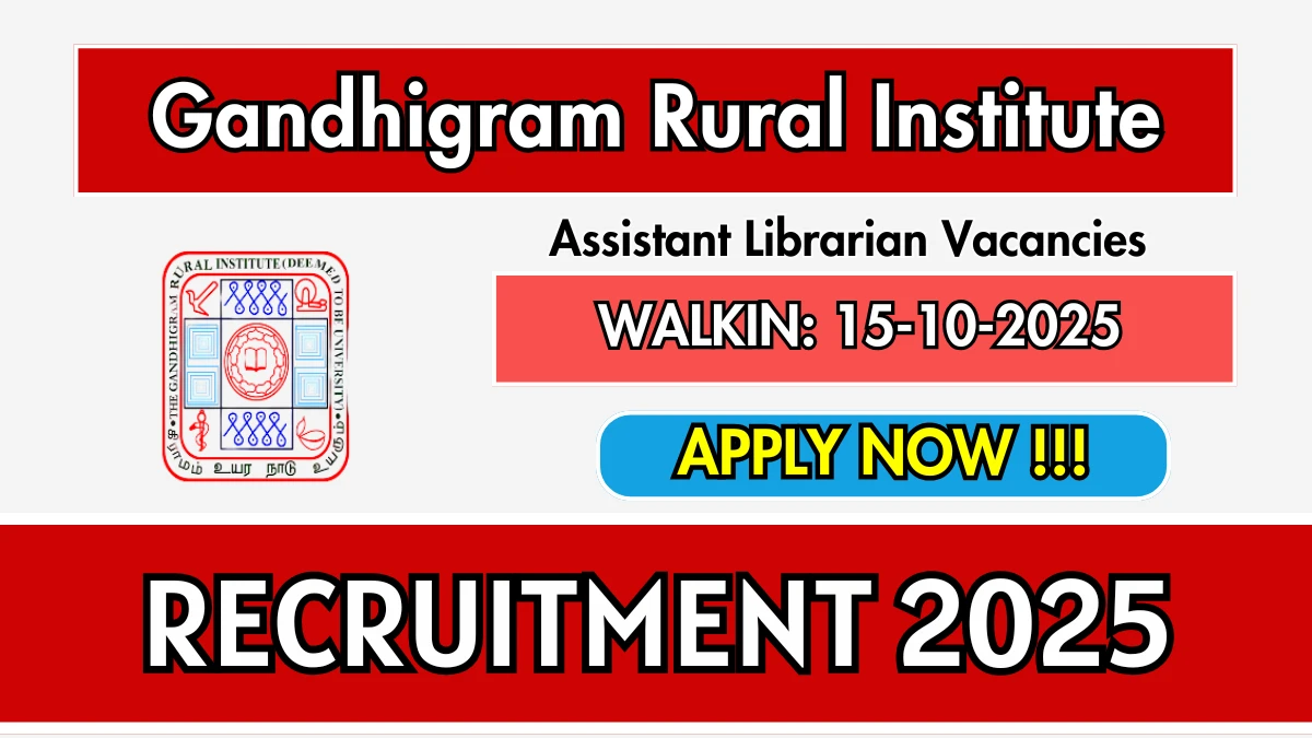 Gandhigram Rural Institute Recruitment 2025 for posts of Assistant Librarian. Candidates with M.Phil/Ph.D, M.Lib Can attend the walkin. The Walk-in on 15-10-2025. For detailed information please visit Gandhigram Rural Institute official website, ruraluniv.ac.in.