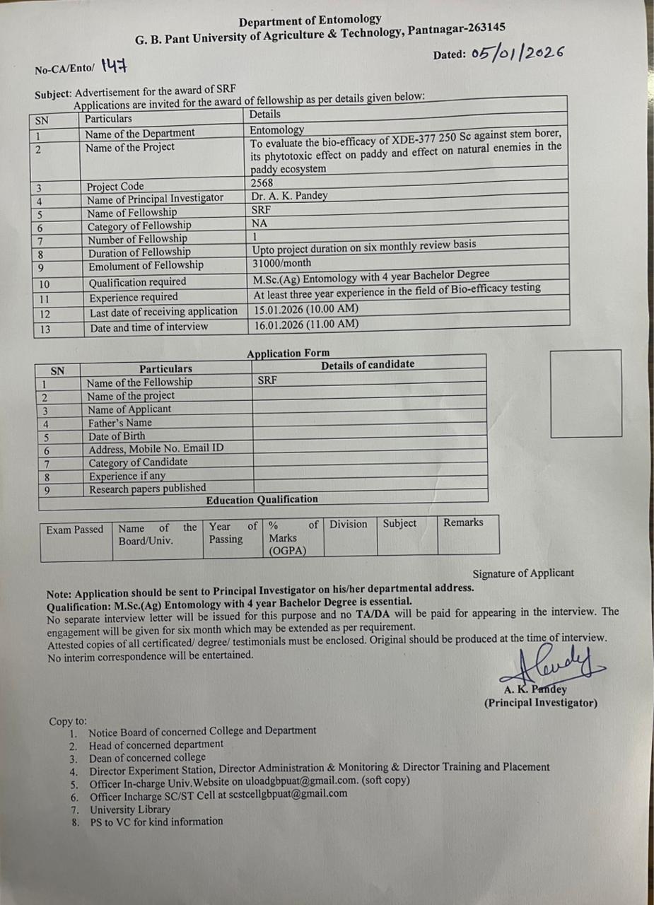 Completed application along with attested copies of certificates/degree/testimonials should be sent to the Principal Investigator, Department of Entomology, G. B. Pant University of Agriculture & Technology, Pantnagar-263145, so as to reach on or before 15.01.2026 (10.00 AM).