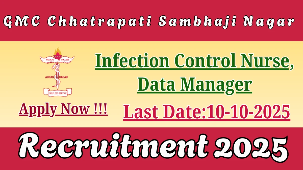 GMC Chhatrapati Sambhaji Nagar has released an official notification for the recruitment of 02 Infection Control Nurse, Data Manager Posts. Interested and eligible candidates can apply Offline through the official GMC Chhatrapati Sambhaji Nagar website. The last date to submit the application form is 10-10-2025. In this article, you’ll find the GMC Chhatrapati Sambhaji Nagar Infection Control Nurse, Data Manager Posts recruitment details, including eligibility criteria, age limit, salary structure, selection process, application steps, and direct links to the official notification and Offline application form.
