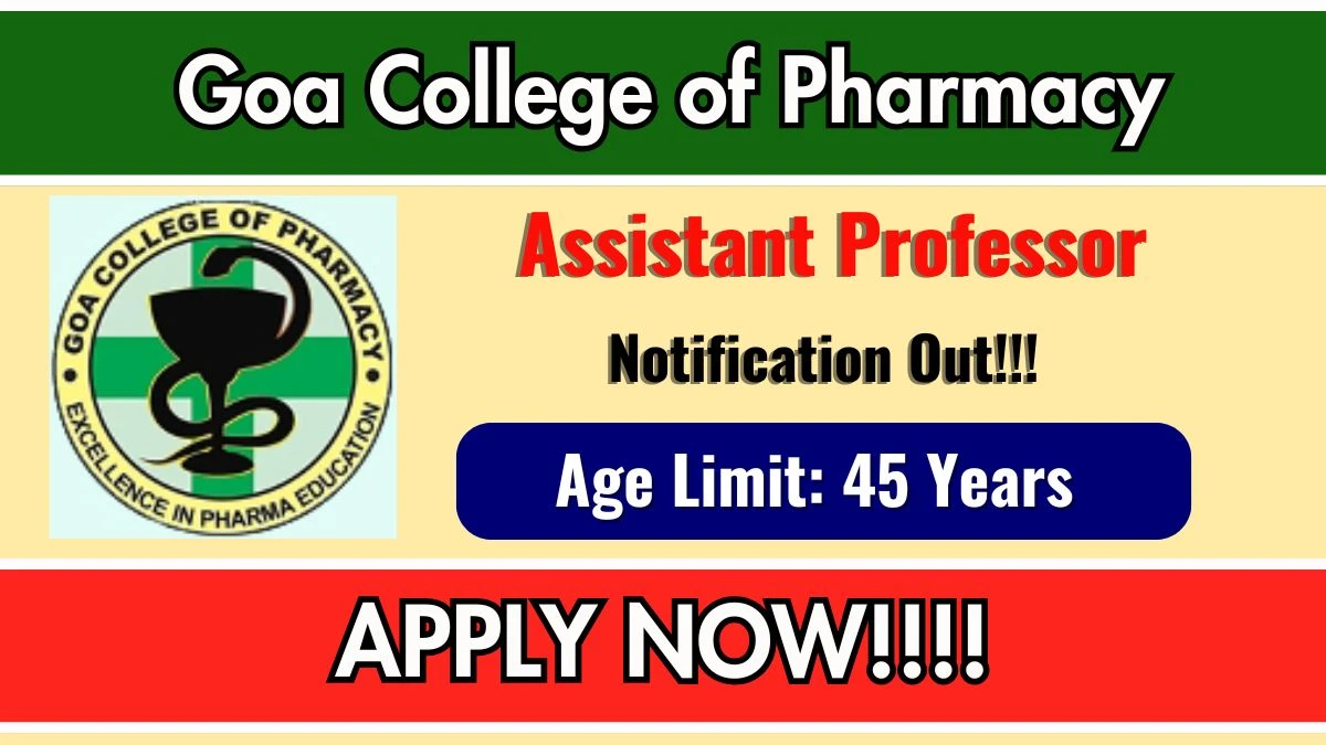 Goa College of Pharmacy has released an official notification for the recruitment of 01 Assistant Professor Posts. Interested and eligible candidates can apply Online through the official Goa College of Pharmacy website. The last date to submit the application form is 24-10-2025. In this article, you’ll find the Goa College of Pharmacy Assistant Professor Posts recruitment details, including eligibility criteria, age limit, salary structure, selection process, application steps, and direct links to the official notification and Online application form.