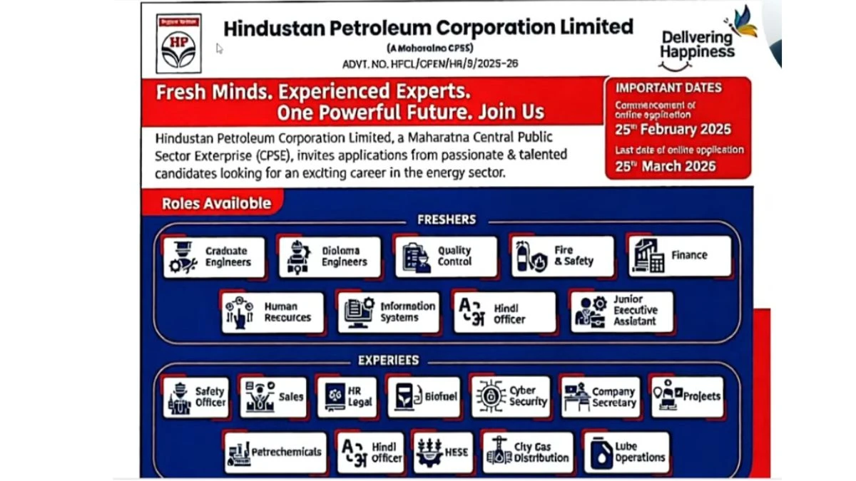 Hindustan Petroleum Corporation (HPCL) has released an official notification for the recruitment of Engineers, Junior Executive Assistant and Other Posts. Interested and eligible candidates can apply Online through the official HPCL website. The last date to submit the application form is 25-03-2026. In this article, you’ll find the HPCL Engineers, Junior Executive Assistant and Other Posts recruitment details, including eligibility criteria, age limit, salary structure, selection process, application steps, and direct links to the official notification and Online application form.
