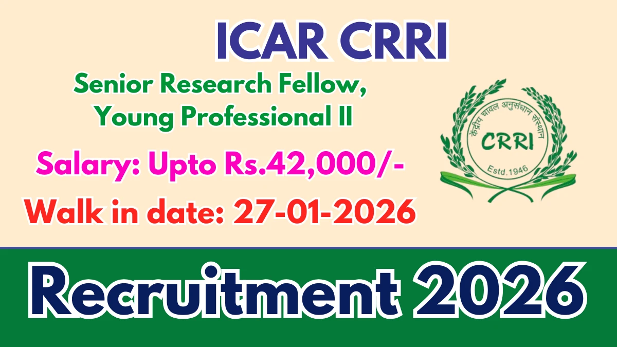 ICAR Central Rice Research Institute (ICAR CRRI) Recruitment 2026 for 02 posts of Senior Research Fellow, Young Professional II. Candidates with B.Sc, Any Post Graduate, M.E/M.Tech, M.Phil/Ph.D Can attend the walkin. The Walk-in on 27-01-2026. For detailed information please visit ICAR CRRI official website, icar-crri.in.