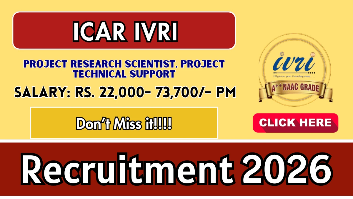 Indian Veterinary Research Institute (ICAR IVRI) Recruitment 2026 for 3 posts of Project Research scientist, Project technical support. Candidates with Post Graduate, Ph.D, Diploma can Attend Walk In. The Walk-in on 16-03-2026. For detailed information please visit ICAR IVRI official website.