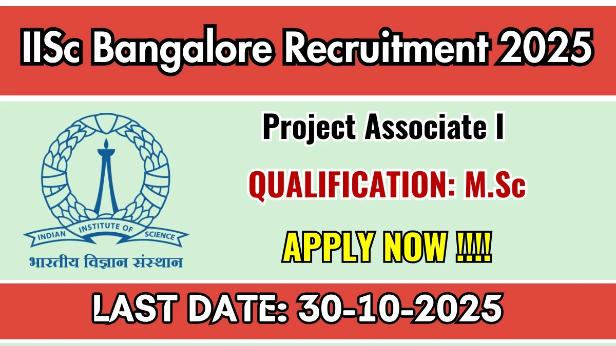 Indian Institute of Science Bangalore (IISc Bangalore) has released an official notification for the recruitment of 07 Project Associate I Posts. Interested and eligible candidates can apply Online through the official IISc Bangalore website. The last date to submit the application form is 30-10-2025. In this article, you’ll find the IISc Bangalore Project Associate I Posts recruitment details, including eligibility criteria, age limit, salary structure, selection process, application steps, and direct links to the official notification and Online application form.